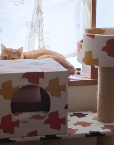キーちゃんが愛用してくれていたタワー。 いろんな都合で低めタワーにしたけど、キーちゃんは上へ上へと目指したい男だったから、今なら天井まで行ける登り棒形式の突っ張りタワーにしてあげるんだけど、残念ながら当時そういうのなかったもので、キーちゃん…